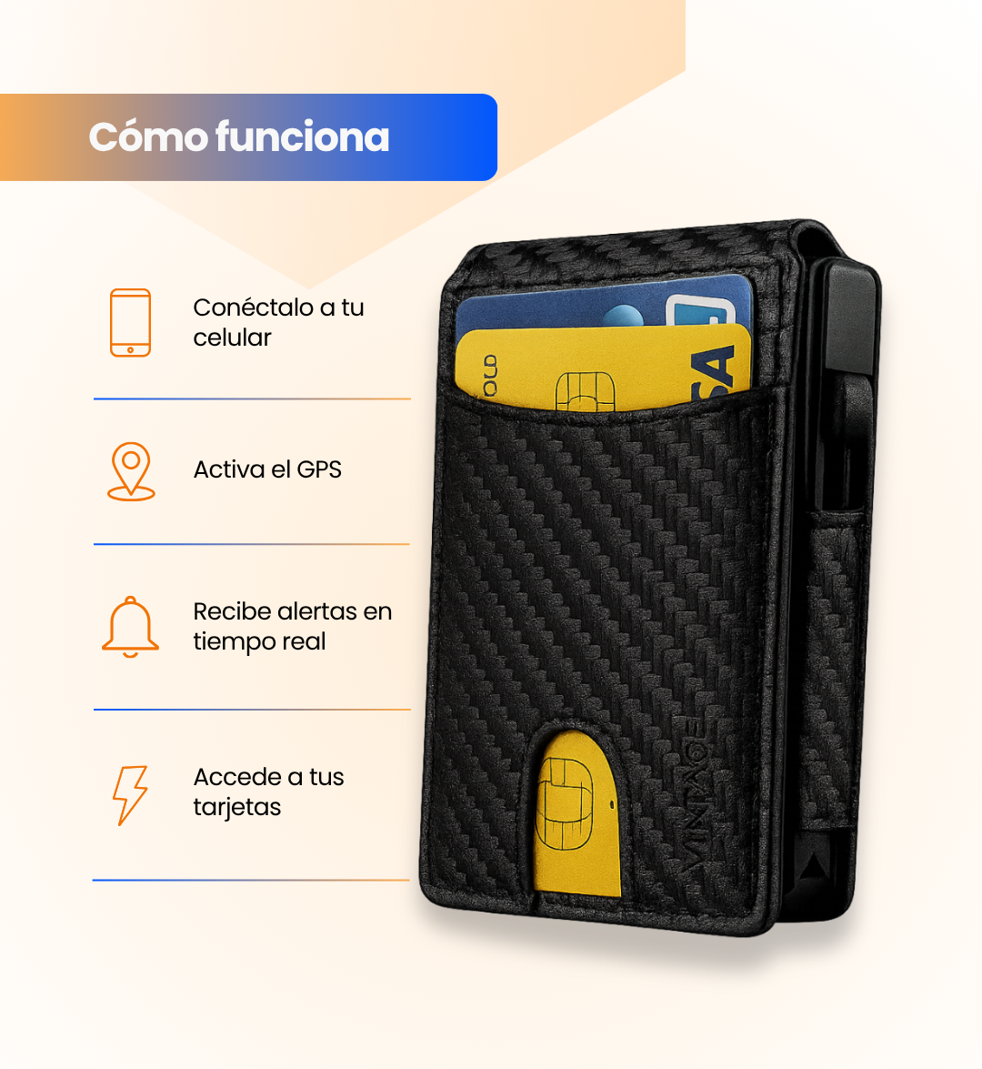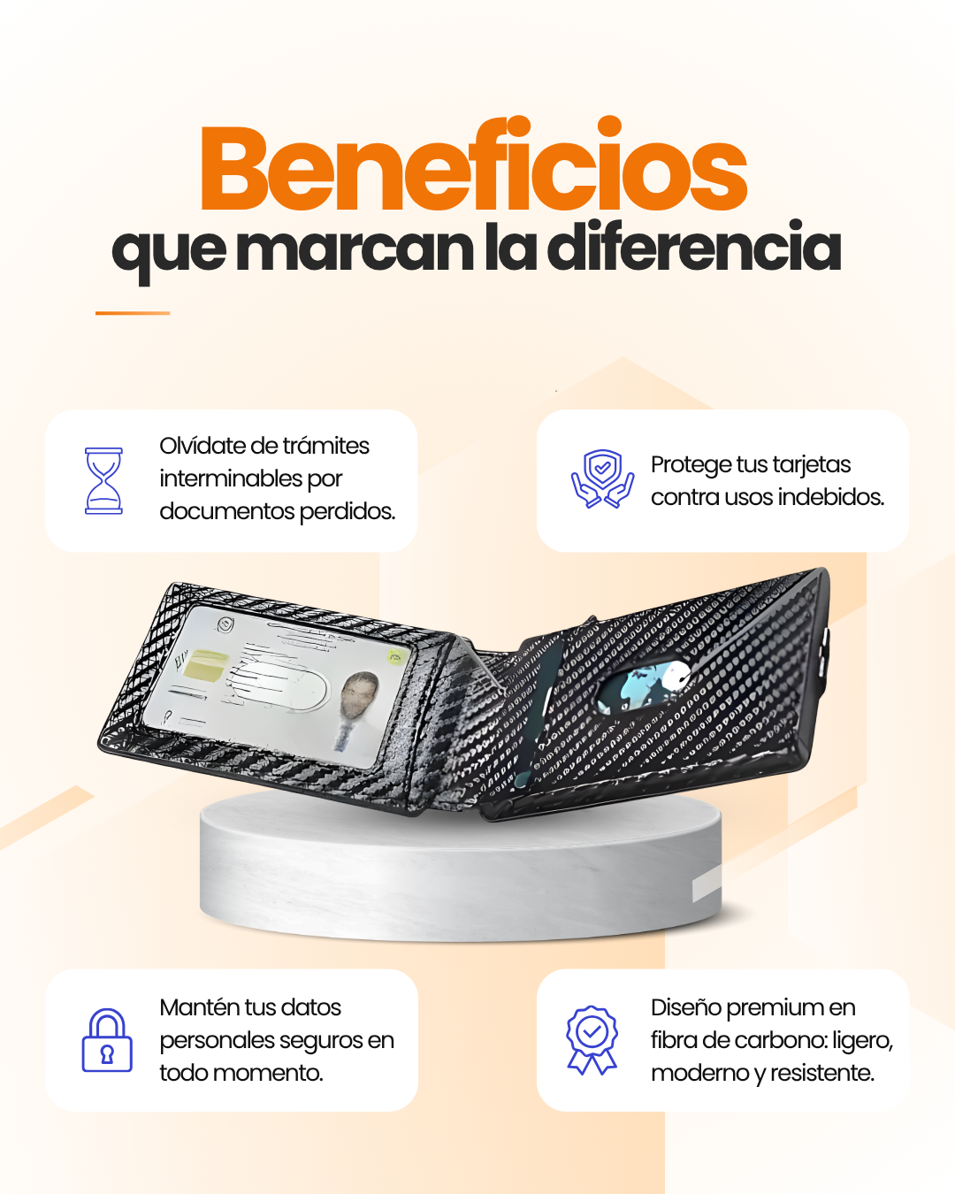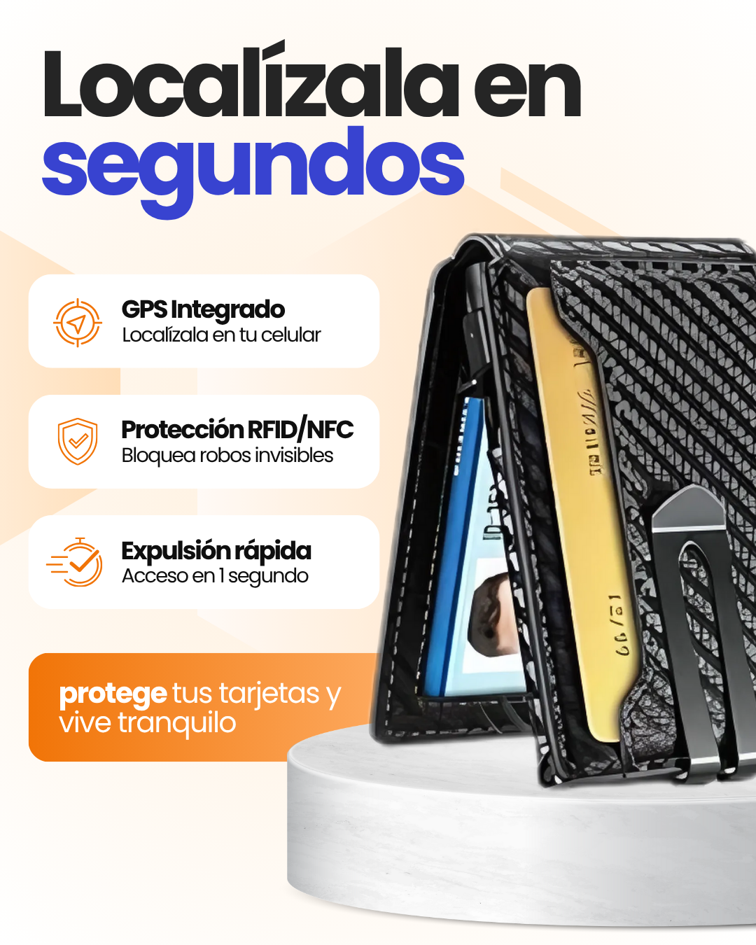 Cuenta con tecnología RFID/NFC que bloquea intentos de clonación o escaneo de tus tarjetas.